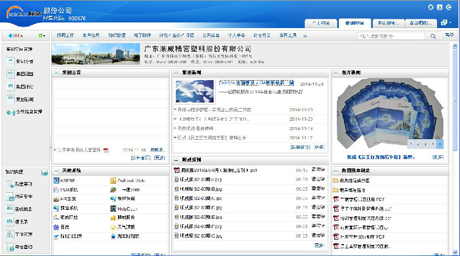 3、2014年11月,順威股份旗下分子公司OA協同系統實現全面上線,蕪湖順威精密塑料有限公司——這最后一座城池計日即可攻破。協同系統涵蓋人力、行政、財務、基建、供應鏈管理等7大職能。系統上的30多份固定表單相當于30多個制度,有了統一表單格式,旨在力推無紙化辦公。而公司領導手機里安裝的系統軟件,則可以打破時空界限,溝通零距離無障礙,實現移動辦公。